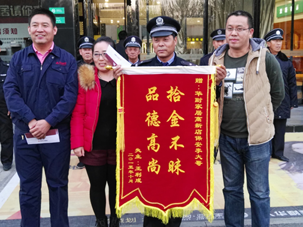 2015年10月23日18是許,保安李明寶在當日營業(yè)結束清場檢查時,在張家口華耐高新店商場南區(qū)3層衛(wèi)生間撿到1只皮挎包,立即教到物業(yè)部值班室,經值班人員共同檢查,內有包括汽車鑰匙、多張信用卡、駕駛證等物品。19時30分,失主前來尋找。次日上午,為感謝李明寶,失主專程送來“拾金不昧,品德高尚”錦旗一面。